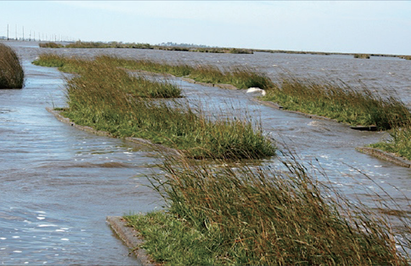 美國(guó)路易斯安娜州Golden Meadow密西西比河流域沿岸自然堤岸河流侵襲影響嚴(yán)重,土質(zhì)改變,原有植被在河水沖刷下毀壞、消失。項(xiàng)目沿岸布設(shè)百奧源®生態(tài)堤岸基質(zhì)材料平鋪布設(shè)于受侵襲的天然堤岸,選用植被為海濱雀稗(Seashore Paspalum)互花米草(Smooth Cord),少量移栽。項(xiàng)目每年簡(jiǎn)單人工維護(hù),并監(jiān)測(cè)河水侵蝕情況。項(xiàng)目布設(shè)后選中植被快速生長(zhǎng)覆蓋了護(hù)岸基質(zhì),并大量生長(zhǎng)。項(xiàng)目布設(shè)9個(gè)月后,植被生長(zhǎng)到3英寸左右,起到護(hù)岸緩沖的作用。植被成活量大,密集生長(zhǎng),固持土壤,緩沖波浪,大大減少對(duì)自然堤岸侵襲。