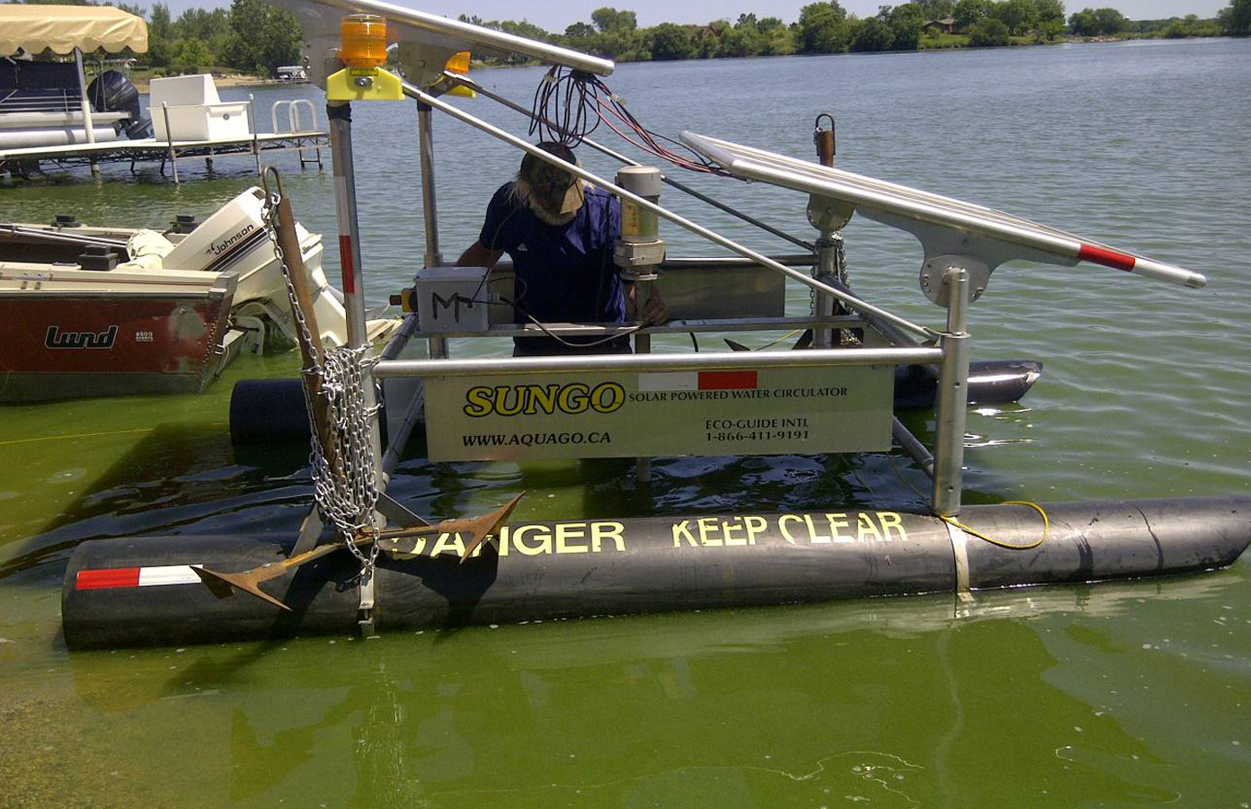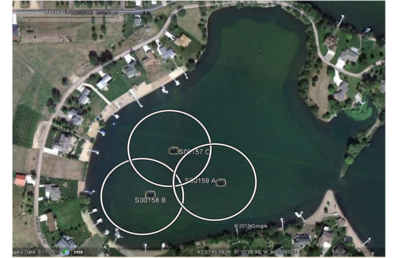 位于美國(guó)南達(dá)科他州Harbor Bay的Madison湖長(zhǎng)期接收周圍農(nóng)業(yè)面源污染、地表徑流和市政污水的污染物入湖,湖底堆積的底泥常年向水中釋放污染物,導(dǎo)致湖體水質(zhì)富營(yíng)養(yǎng)化嚴(yán)重 。2012年6月初由于干旱湖水水面下降,藍(lán)藻大規(guī)模爆發(fā)。根據(jù)該項(xiàng)目現(xiàn)場(chǎng)踏勘及底泥調(diào)查結(jié)果,設(shè)計(jì)將三臺(tái)奧科?太陽(yáng)能循環(huán)復(fù)氧設(shè)備以三角形點(diǎn)位布設(shè)。